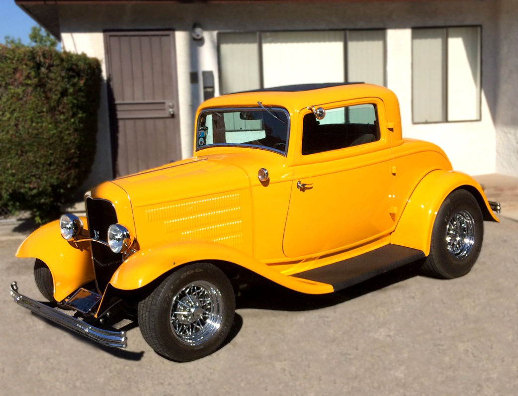 This 1932 Ford 3-Window Coupe, finished in a striking chrome yellow, is a steel-bodied example built for reliable street use and show-level presentation. Powered by a 350ci Chevrolet crate V8 with dual Edelbrock carburetors, it channels an estimated 300+ horsepower through a 700R4 automatic transmission with overdrive to a Ford 9-inch rear differential. A custom chassis supports coilover suspension front and rear, with disc brakes up front and drum brakes at the rear for confident stopping power.